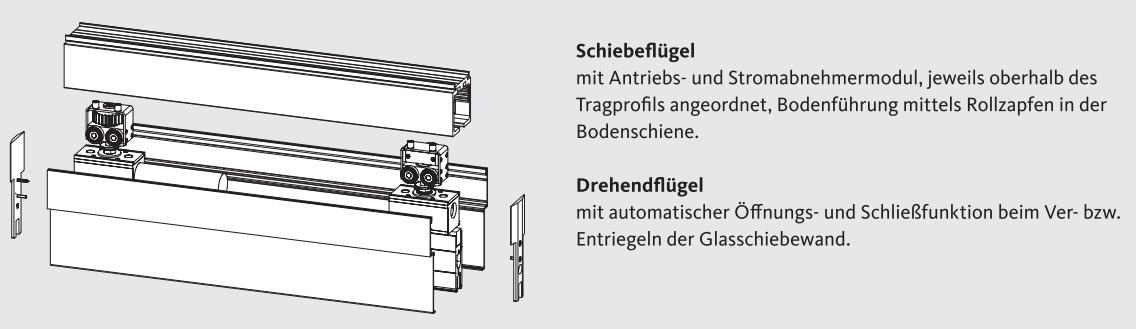 Diese garantieren eine dauerhaft zuverlässige Funktion und leise Bewegung der Elemente. Durch die geringe Einbauhöhe der Laufschiene von nur 86,5 mm ist nahezu überall ein deckenbündiger Einbau möglich. Die grundsätzlich erforderliche Bodenführung sorgt für zusätzliche Stabilität und besonderen Anwendungskomfort. Aus Sicherheitsgründen bleibt die automatische Ganzglasschiebewand bei Stromausfall manuell verfahrbar.