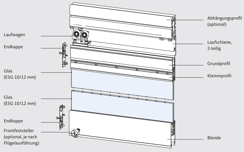 Die kompakte Bauweise erfordert nur minimalen Platzbedarf für Laufschiene und Parknischen. Durchgänge lassen sich mit Drehendflügeln realisieren. Die Laufwerke sind mit hochwertigen kugelgelagerten Laufrollen ausgestattet und garantieren eine dauerhaft zuverlässige Funktion und leichtgängige Bewegung der Elemente beim Öffnen und Schließen. Bei Glasbruch sind die Klemmprofile durch spezielle Beschläge vor dem Herunterfallen geschützt.