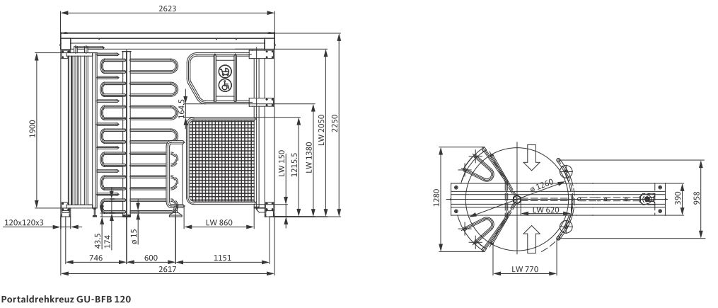 Das motorgetriebene Portaldrehkreuz GU-BFB 120 ermöglicht die barrierefreie Durchfahrt mit Rollstühlen und die Mitnahme von Kinderwagen, Gepäck oder Fahrrädern. Drehstern, Sperrbügel sowie die Tür und das Fixteil sind aus rostfreiem Edelstahl gefertigt. Es ist besonders für den Werkschutz im Außenbereich sowie für Freizeiteinrichtungen und Übergänge von Tiefgaragen zu Gebäuden geeignet. Das Portaldrehkreuz GU-BFB 120 bietet durch seine 120°-Teilung hohen Durchgangskomfort bei zuverlässiger Vereinzelung.