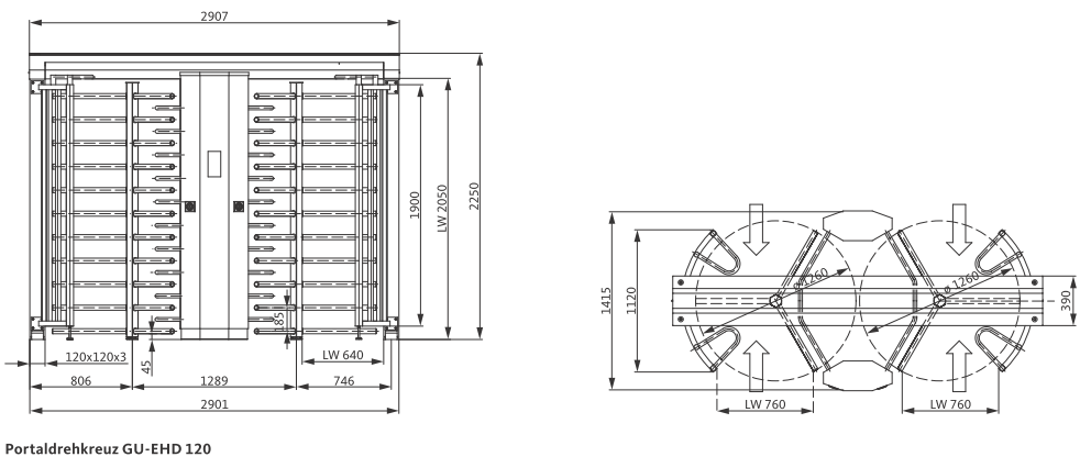 Das motorgetriebene Portaldrehkreuz GU-EHD 120 ist die Doppel-Ausführung des GU-EHE 120. Drehstern und Sperrelemente sind aus rostfreiem Edelstahl gefertigt. Die Brücke mit Abdeckblechen sowie die Mittelbox sind feuerverzinkt und pulverbeschichtet. Das Portaldrehkreuz GU-EHD 120 eignet sich optimal für hohe Personenfrequenzen im Außenbereich. Die Mittelbox bietet Einbaumöglichkeiten für Kartenleser, Gegensprechanlagen und weitere Arten von Zutrittskontrollsystemen. Die wartungsfreundliche Steuerung ist oben in der Brücke untergebracht.