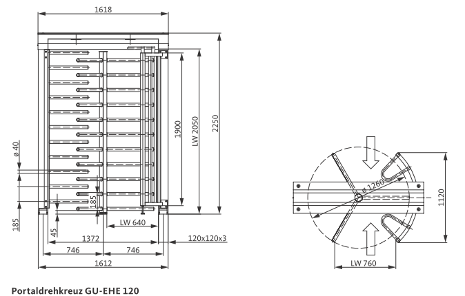 Das motorgetriebene Portaldrehkreuz GU-EHE 120 mit Drehstern und Abweisrechen aus rostfreiem Edelstahl eignet sich hervorragend für den Werkschutz im Außenbereich sowie für Stadien und Übergänge von Tiefgaragen zu Gebäuden. Dank kleiner Baugröße fügt es sich harmonisch in Zaunanlagen ein. Das Portaldrehkreuz GU-EHE 120 bietet durch die 120°-Teilung hohen Durchgangskomfort bei sicherer Vereinzelung.